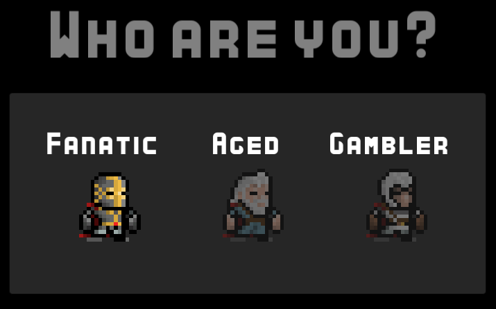 You can tackle Rogue Tap as the Fanatic, the Aged, or the Gambler. Each character has unique start conditions and abilities.